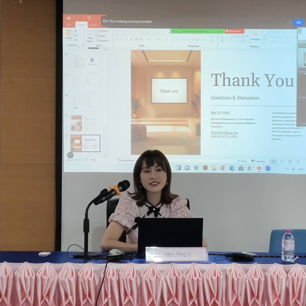 ขอแสดงความยินดีกับ Miss Ying Li นักศึกษาหลักสูตรปรัชญาดุษฎีบัณฑิต สาขาวิชาการบริหารการพัฒนา ที่ผ่านการสอบป้องกันวิทยานิพนธ์ อยู่ในระดับดีเยี่ยม ในหัวข้อเรื่อง "Application of Digital Technology in Enhancing Emotional Elements of Tourismin Zhejiang Province" โดยมี ผู้ช่วยศาสตราจารย์ (พิเศษ) ดร.เอื้ออัมพร ทิพยทิฆัมพร เป็นกรรมการอาจารย์ที่ปรึกษาหลัก ในวันพุธที่ ๑ ตุลาคม พ.ศ. ๒๕๖๘ เวลา ๐๙.๐๐ น. ณ ห้องประชุม ชั้น ๓ อาคาร ๓๑ มหาวิทยาลัยราชภัฏสวนสุนันทา