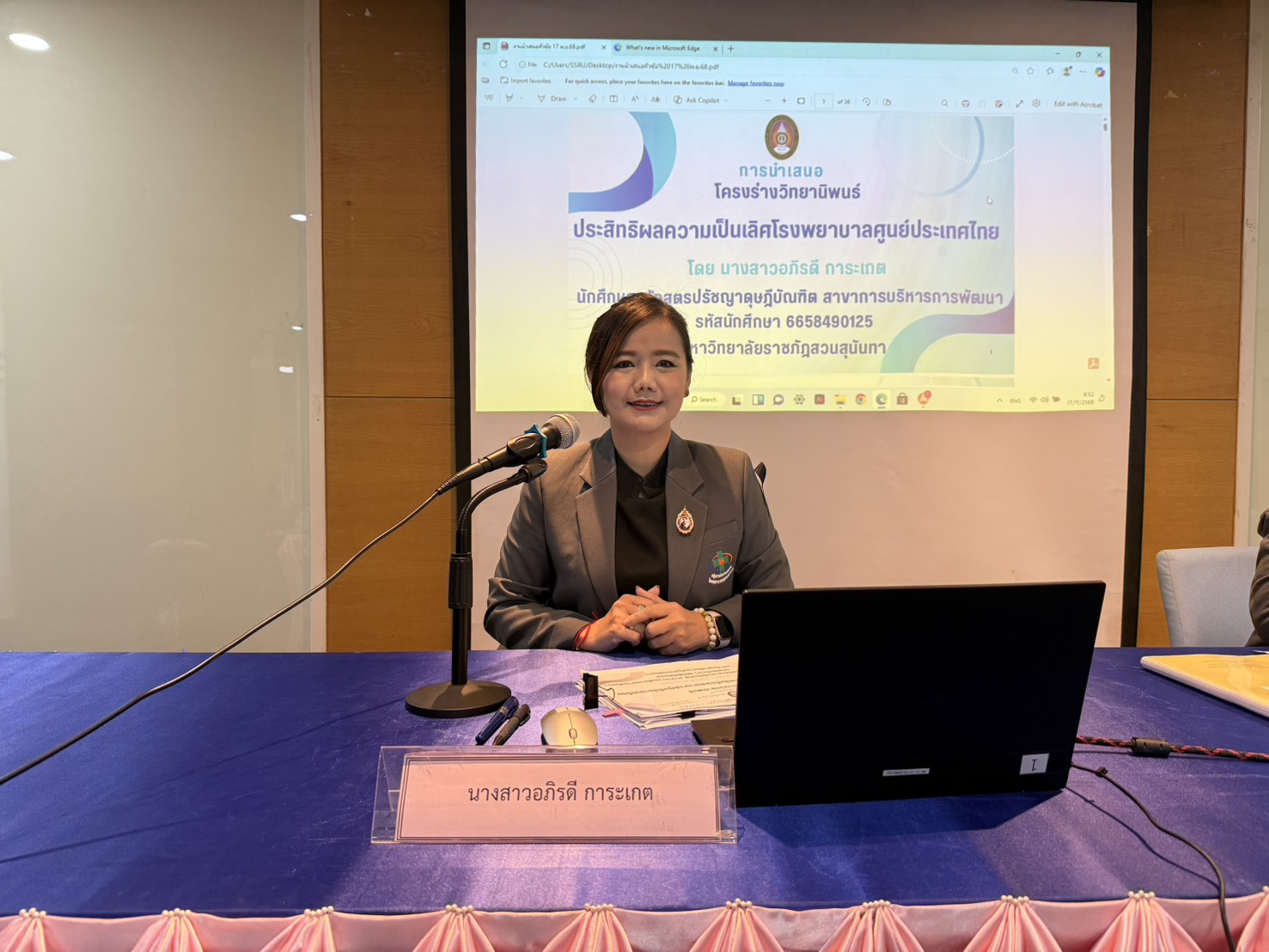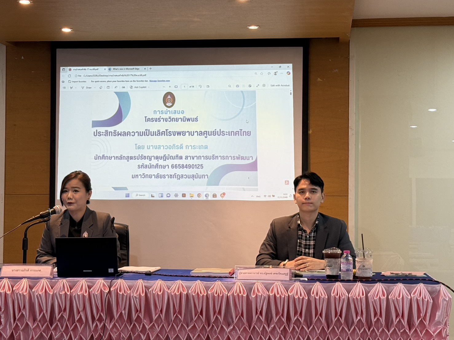 ขอแสดงความยินดีกับ นางสาวอภิรดี การะเกต นักศึกษาหลักสูตรปรัชญาดุษฎีบัณฑิต สาขาวิชาการบริหารการพัฒนา ที่ผ่านการสอบเค้าโครงวิทยานิพนธ์ ในหัวข้อเรื่อง "ประสิทธิผลความเป็นเลิศ โรงพยาบาลศูนย์ประเทศไทย" โดยมี ผศ.ดร.วิชิต สุรดินทร์กูร เป็นกรรมการอาจารย์ที่ปรึกษาหลัก ,ผศ.ดร.นลินี สุรดินทร์กูร และรศ.(พิเศษ) ดร.ศรีปริญญา ธูปกระจ่างเป็นกรรมการอาจารย์ที่ปรึกษาร่วมในวันจันทร์ที่ ๑๘ พฤศจิกายน พ.ศ. ๒๕๖๘ เวลา ๑๓.๐๐ น. ณ ห้องประชุม ชั้น ๓ อาคาร ๓๑ มหาวิทยาลัยราชภัฏสวนสุนันทา