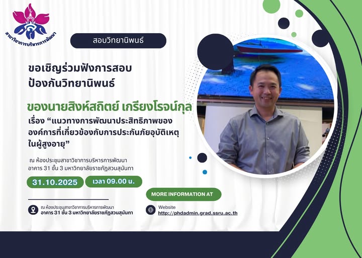 "นายสิงห์สถิตย์ เกรียงโรจน์กุล" นักศึกษาหลักสูตรปรัชญาดุษฎีบัณฑิต สาขาวิชาการบริหารการพัฒนา ในหัวข้อเรื่อง "แนวทางการพัฒนาประสิทธิภาพขององค์การที่เกี่ยวข้องกับการประกันภัยอุบัติเหตุในผู้สูงอายุ” โดยมี ผศ.(พิเศษ)ดร.สโรชินี ศิริวัฒนา เป็นประธานกรรมการที่ปรึกษาวิทยานิพนธ์ และ อาจารย์ ดร.ดวงกมล จันทรรัตน์มณี เป็นกรรมการที่ปรึกษาร่วมวิทยานิพนธ์ ในวันศุกร์ที่ 31 ตุลาคมคม พ.ศ. 2568 เวลา 09.00 น. ณ ห้องประชุม ชั้น 3 อาคาร 31 มหาวิทยาลัยราชภัฏสวนสุนันทา