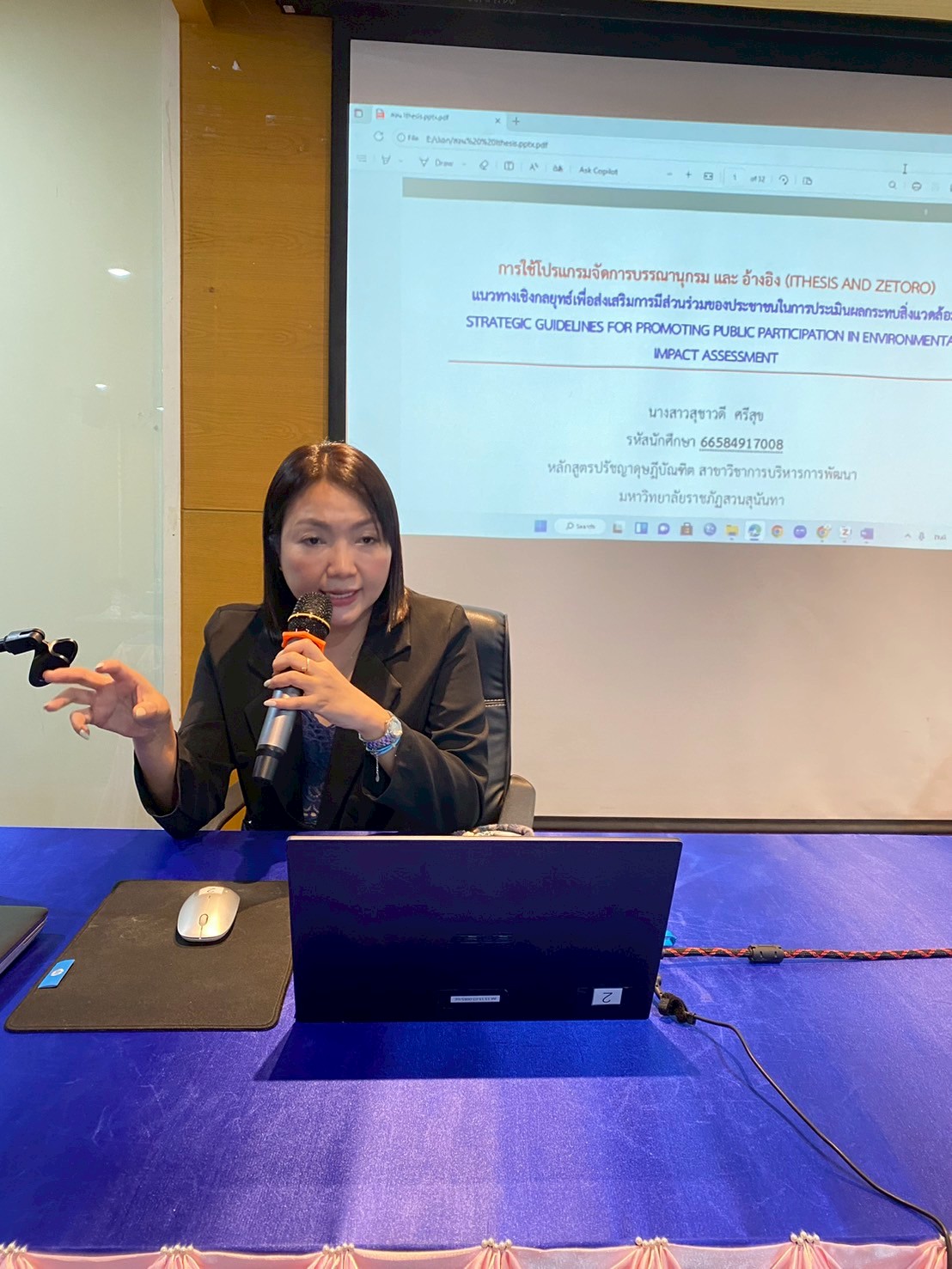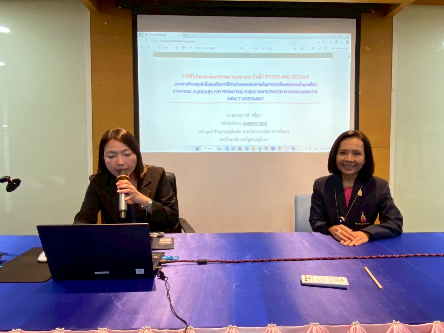 ผู้ช่วยศาสตราจารย์ ดร. สุรมน จันทร์เจริญ และ นางสาวสุชาวดี ศรีสุข ให้คำบรรยาย เรื่องการใช้โปรแกรมจัดการบรรณานุกรม และ อ้างอิง (ITHESIS AND ZETORO) แนวทางเชิงกลยุทธ์เพื่อส่งเสริมในการมีส่วนร่วม ของประชาชนในการประเมินผลกระทบสิ่งแวดล้อม หลักสูตร ปรัชญาดุษฎีบัณฑิต สาขาวิชา การ บริหารการพัฒนา โดยมี นักศึกษาเข้าร่วมรับฟังการบรรยายดังกล่าวจำนวนมาก