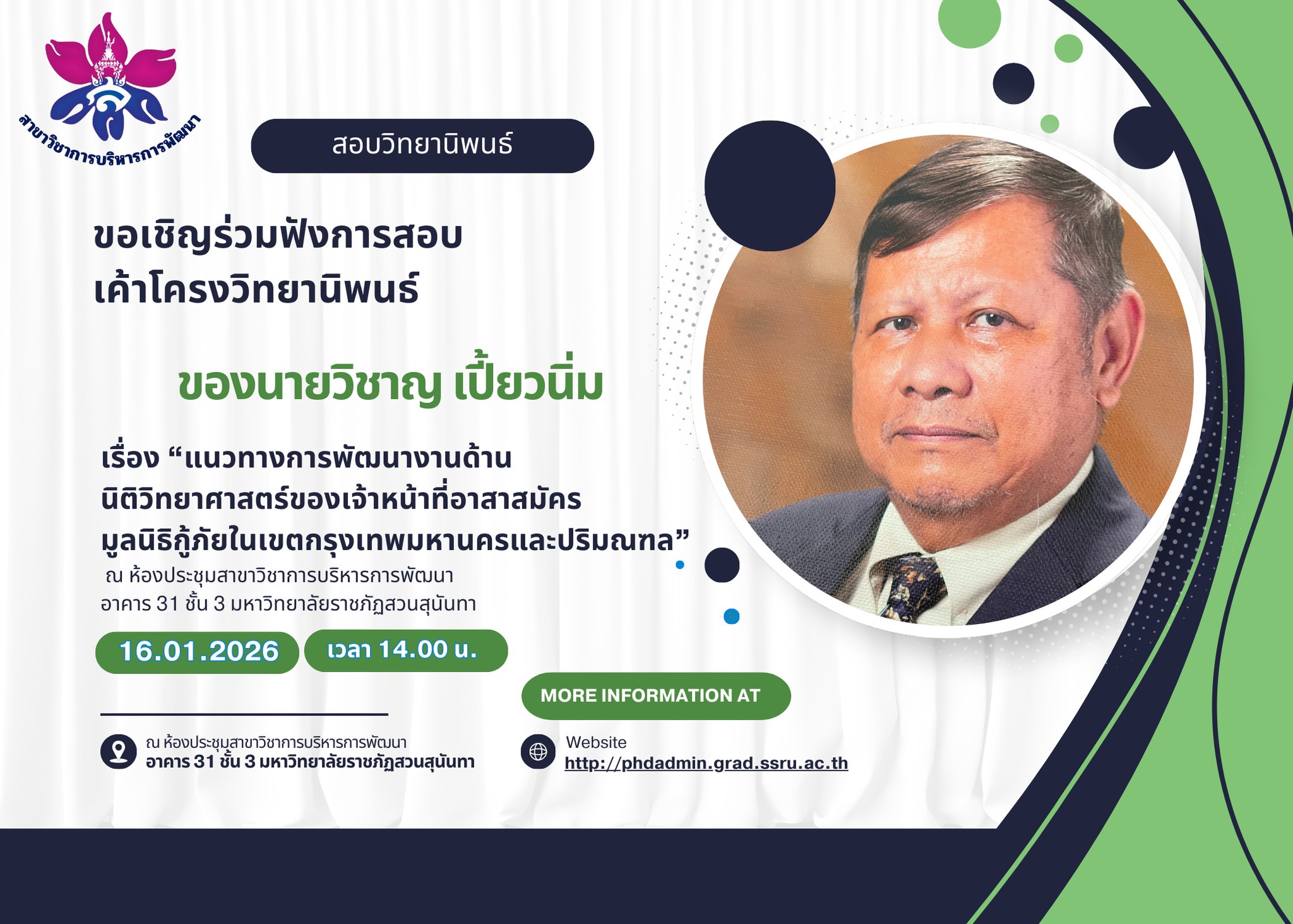 นิติวิทยาศาสตร์ของเจ้าหน้าที่อาสาสมัครมูลนิธิกู้ภัยในเขตกรุงเทพมหานครและปริมณฑล” โดยมี ผศ.(พิเศษ) พลโท ดร.ทวี แจ่มจำรัส เป็นกรรมการอาจารย์ที่ปรึกษาหลัก และอาจารย์ ดร.กาญจนา โพธิวิชยานนท์ เป็นกรรมการอาจารย์ที่ปรึกษาร่วม ในวันศุกร์ที่ 16 มกราคม พ.ศ. 2569 เวลา 14.00 น. ณ ห้องประชุม ชั้น 3 อาคาร 31 มหาวิทยาลัยราชภัฏสวนสุนันทา