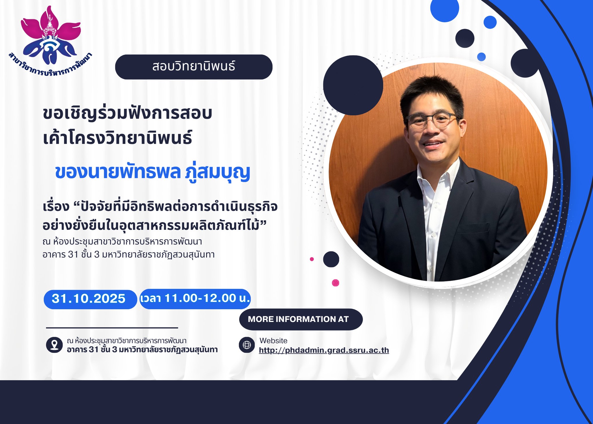 "นายพัทธพล ภู่สมบุญ" นักศึกษาหลักสูตรปรัชญาดุษฎีบัณฑิต สาขาวิชาการบริหารการพัฒนา ในหัวข้อเรื่อง “ปัจจัยที่มีอิทธิพลต่อการดำเนินธุรกิจอย่างยั่งยืนในอุตสาหกรรมผลิตภัณฑ์ไม้” โดยมี ผศ.(พิเศษ) ดร.ดร.สโรชินี ศิริวัฒนา เป็นประธานกรรมการที่ปรึกษาวิทยานิพนธ์ และ ผศ.ดร.ศมานันทน์ รัตนศิริวิไล เป็นกรรมการที่ปรึกษาร่วมวิทยานิพนธ์ ในวันศุกร์ที่ 31 ตุลาคม พ.ศ. 2568 เวลา 11.00 น. ณ ห้องประชุม ชั้น 3 อาคาร 31 มหาวิทยาลัยราชภัฏสวนสุนันทา